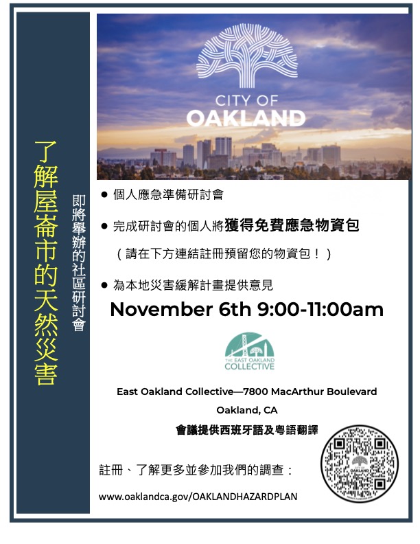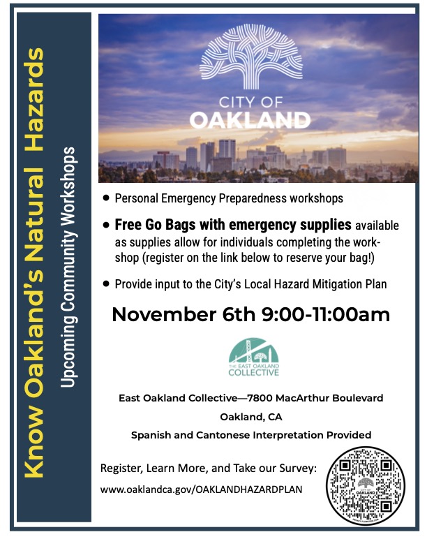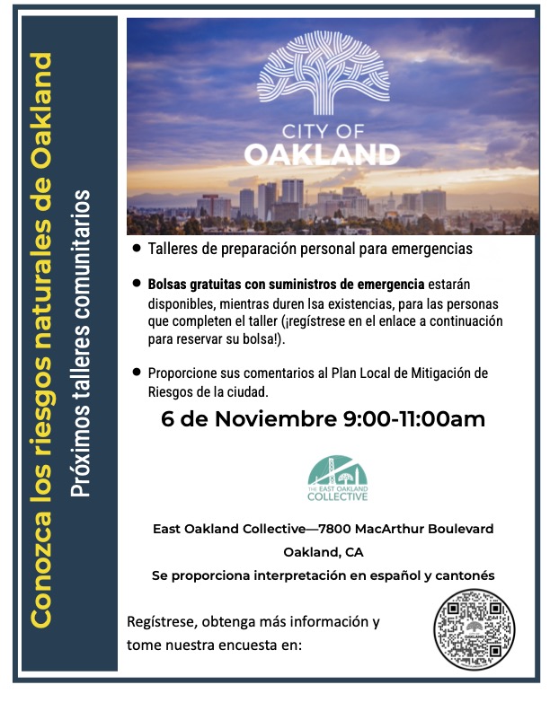 Conozca los riesgos naturales de Oakland. Bolsas gratuitas con suministros de emergencia estarán disponibles, según la disponibilidad, para las personas que completen el taller. Se proporciona interpretación en español y cantonés.