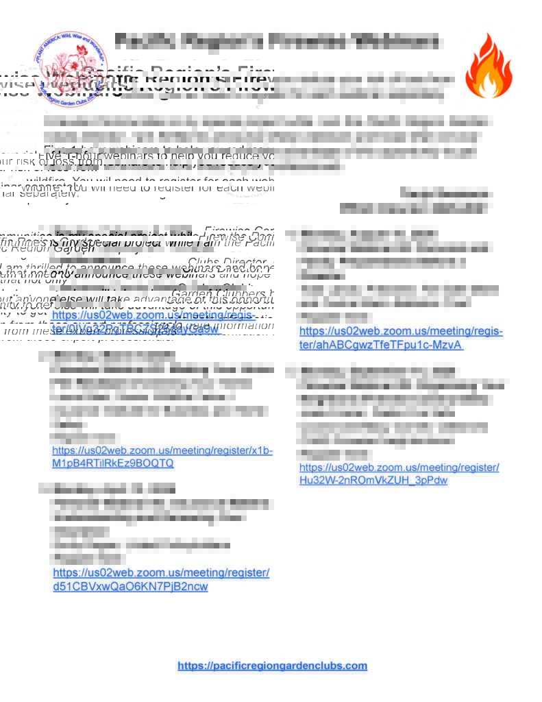 Monday, 2-3pm. First in the series of five 1-hour Firewise Webinars to help you reduce your risk of loss from wildfire. Firewise landscaping with Priscilla Robinson-President, Clackamas County Master Gardeners. Hosted by Pacific Region Garden Clubs who ask that you tell your Garden Club friends, your neighbors, your local fire department and even your local Firewise Communities about this special informative series.